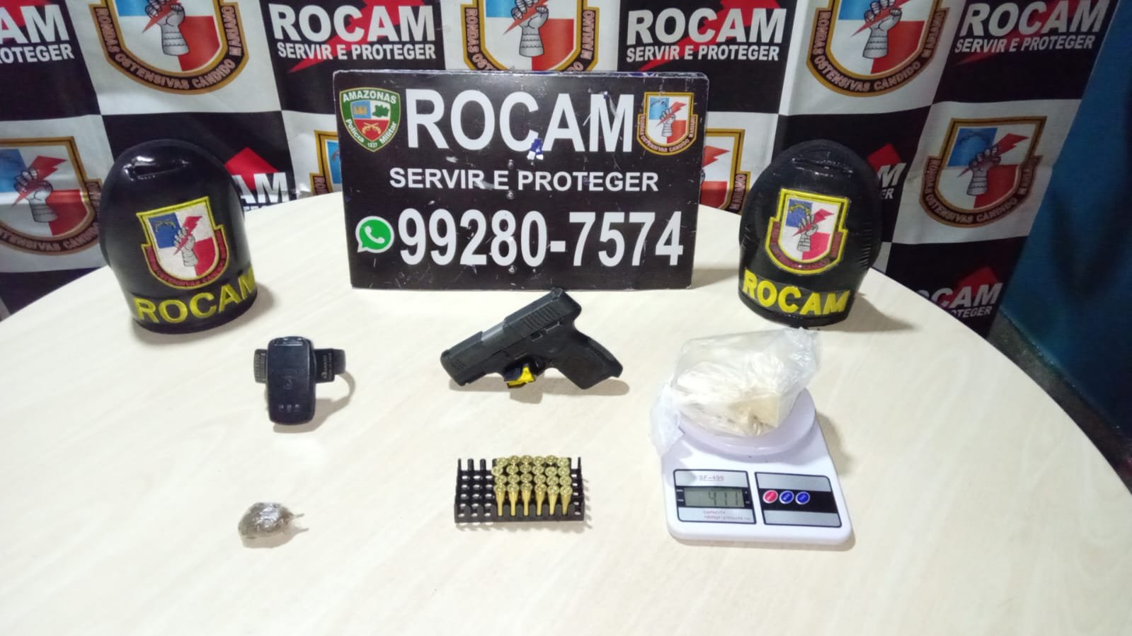 Policiais militares das Rocam prenderam um homem, de 22 anos, pelo crime de tráfico de drogas e porte ilegal de arma de fogo, no bairro Lago Azul, zona norte da capital. Com o suspeito, os policiais apreenderam uma porção de maconha, uma porção de oxi, uma arma de fogo, 24 munições, uma balança de precisão e uma tornozeleira eletrônica rompida. O suspeito foi levado para o 6ºDIP.