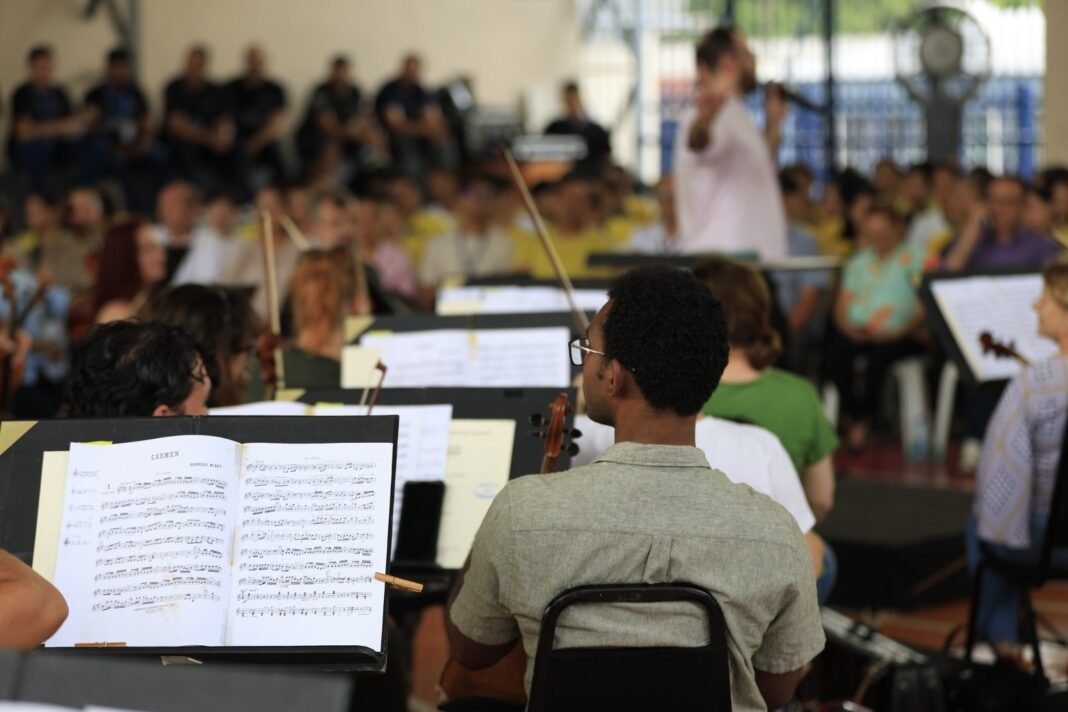 Apostando no formato didático e interativo, o maestro Otávio Simões apresentou a família dos instrumentos musicais e explicou a função do maestro frente à orquestra. “Isso mostra que a orquestra está cumprindo a sua função. Todos nós começamos a estudar a música numa circunstância parecida com essa, assistimos a alguma orquestra, que foi tocar em alguma escola ou tivemos oportunidade de ver em algum lugar. O que estamos fazendo é mostrar para esses jovens como funciona uma orquestra. Saímos desse tipo de projeto com muita satisfação, com muita alegria”, destaca o maestro.