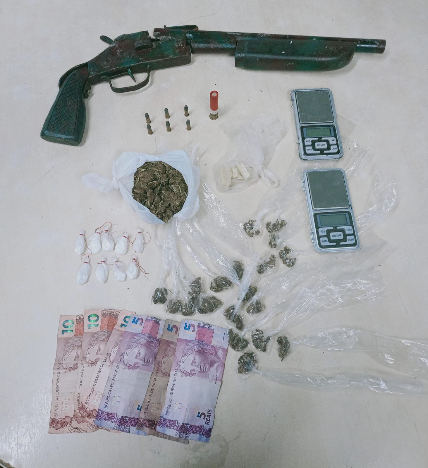 A ação policial resultou na apreensão de uma espingarda calibre 36, uma munição deflagrada do mesmo calibre, seis munições não deflagradas calibre 22, além 19 trouxinhas e uma porção de maconha, nove trouxinhas de cocaína, uma porção de oxi, duas balanças de precisão e R$ 40 em espécie. O material apreendido foi encaminhado para o 14º Distrito Integrado de Polícia (DIP).