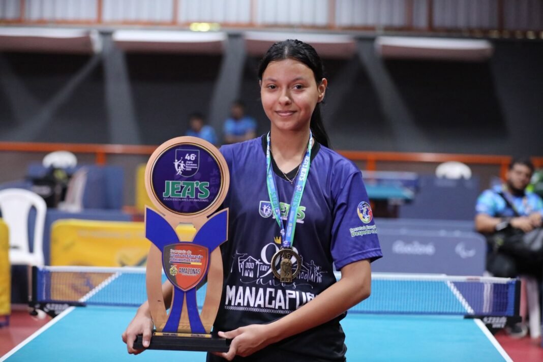 Já no tênis de mesa, outra modalidade que iniciou nesta sexta-feira e que também já teve premiações, o pódio da categoria juvenil feminino I foi completo com alunas da rede estadual de ensino e oriundas de municípios do interior o Amazonas. Geovanna Meireles, aluna da Escola Estadual Castelo Branco, em Manacapuru (distante 68 quilômetros da capital), foi a grande campeã. A 2ª e a 3ª colocação foram ocupadas por alunas do Colégio Batista de Parintins e da Escola Estadual Quitó Tatikawa, em Itapiranga (distante 227 quilômetros).