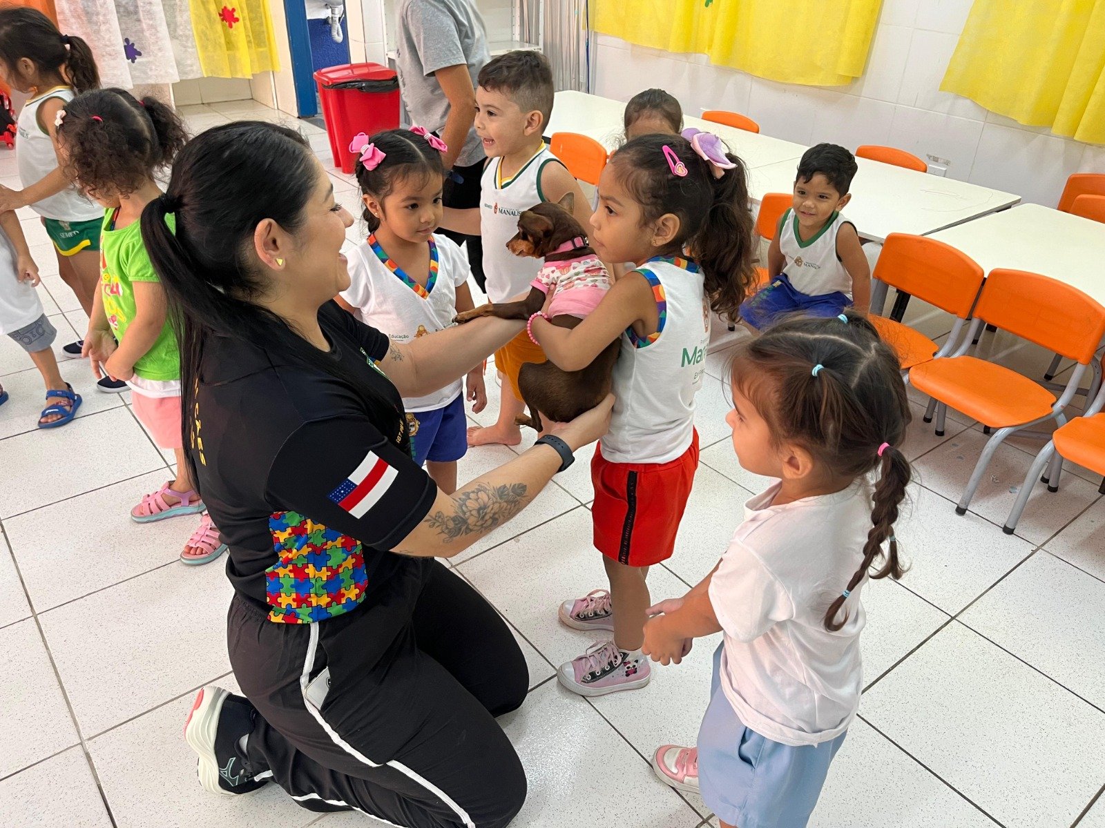 Em uma ação que une educação, empatia e cuidado com o desenvolvimento infantil, a Prefeitura de Manaus, por meio da Secretaria Municipal de Educação (Semed), em parceria com o Batalhão de Incêndio Florestal e Meio Ambiente da Polícia Militar, realizou, nesta quarta-feira, 9/7, a Cinoterapia, por meio do projeto “Cão Bombeiro, Cão Esperança”. A ação aconteceu na creche municipal Professora Dalvina do Nascimento Martins, localizada no bairro Cidade Nova, zona Norte da capital.