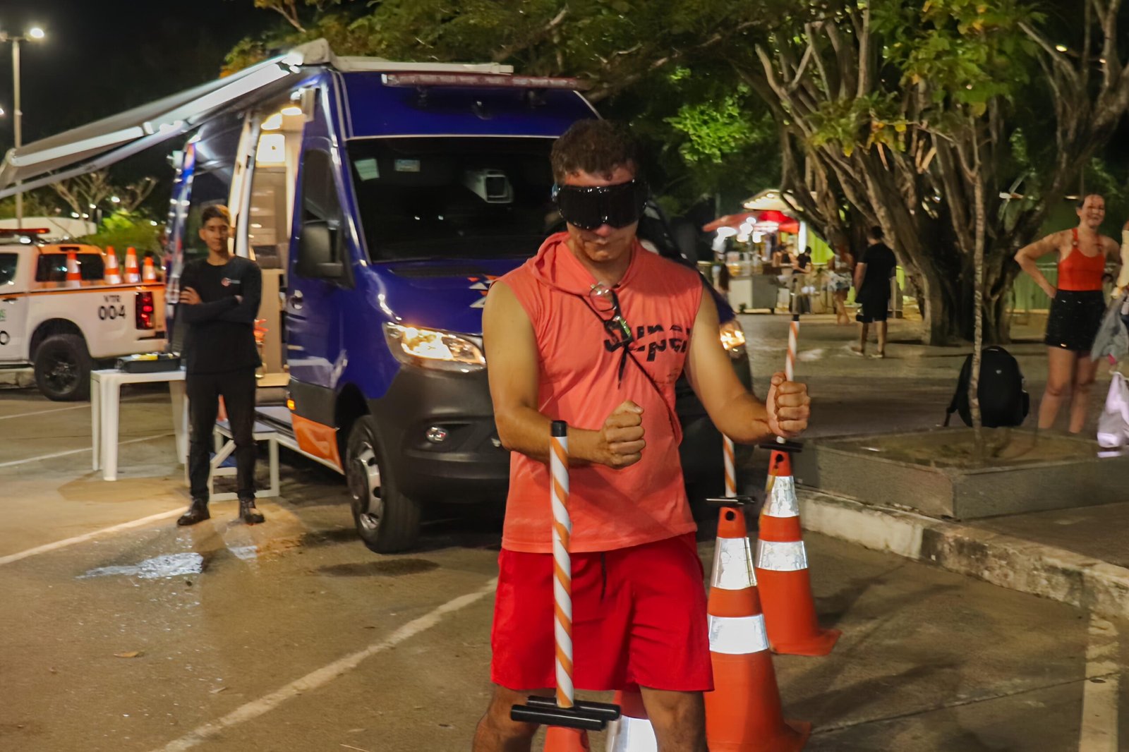 Participando da atividade com óculos simulador de embriaguez e uso de drogas, o designer Rafael dos Santos, 36, compreendeu como as substâncias afetam a percepção do condutor. “A parte com óculos de álcool foi um pouco mais fácil, mas em um determinado pedaço do percurso, já não estava dando para enxergar muito bem. Mas, com o de droga, não tinha condição de ver nada. Bati em dois obstáculos e foi difícil. É melhor não dirigir embriagado nem sob efeito de drogas”, relatou o designer.