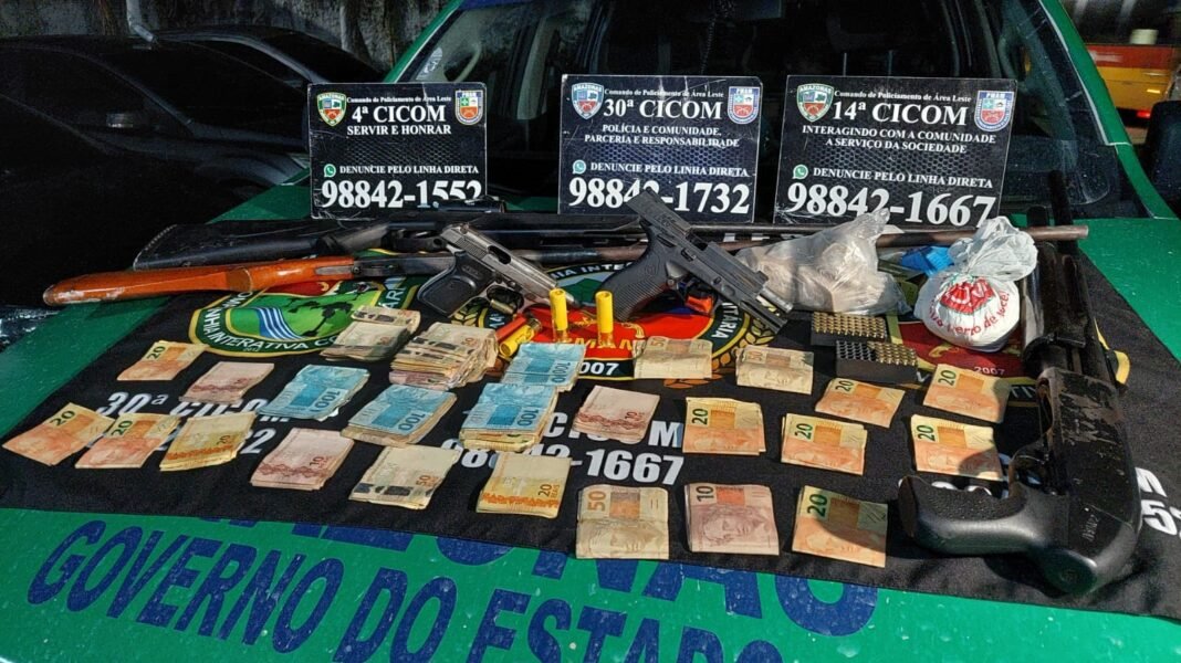 Ao todo, foram apreendidas seis armas, sendo duas pistolas calibre .380, uma escopeta calibre .12 e três espingardas calibres .20, 22 e 28; 79 munições, sendo 75 de calibre .22, três de calibre .20 e uma deflagrada, de calibre .12; sete porções de produto análogo a oxi; cinco porções de material similar a cocaína; dois aparelhos celulares; R$ 7.031,00 em espécie; e 18 galos.