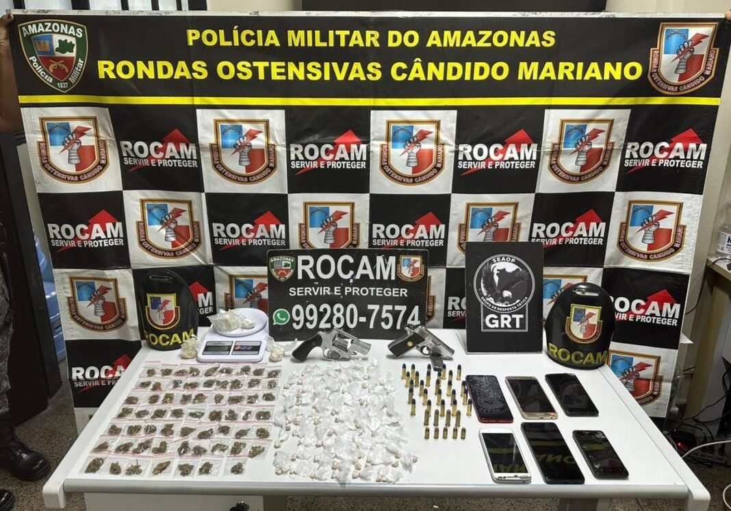 No bairro União, zona centro-sul da capital, policiais militares da Ronda Ostensiva Cândido (Rocam) prenderam um homem, 26, pelo crime de tráfico de drogas e porte ilegal de arma de fogo. Com o suspeito foram apreendidos uma pistola, um revólver, 34 munições, quatro porções médias de oxi, 61 porções pequenas de oxi, 85 porções pequenas de maconha, uma balança de precisão e seis celulares. O suspeito foi levado para o Departamento de Investigação sobre Narcóticos (Denarc).