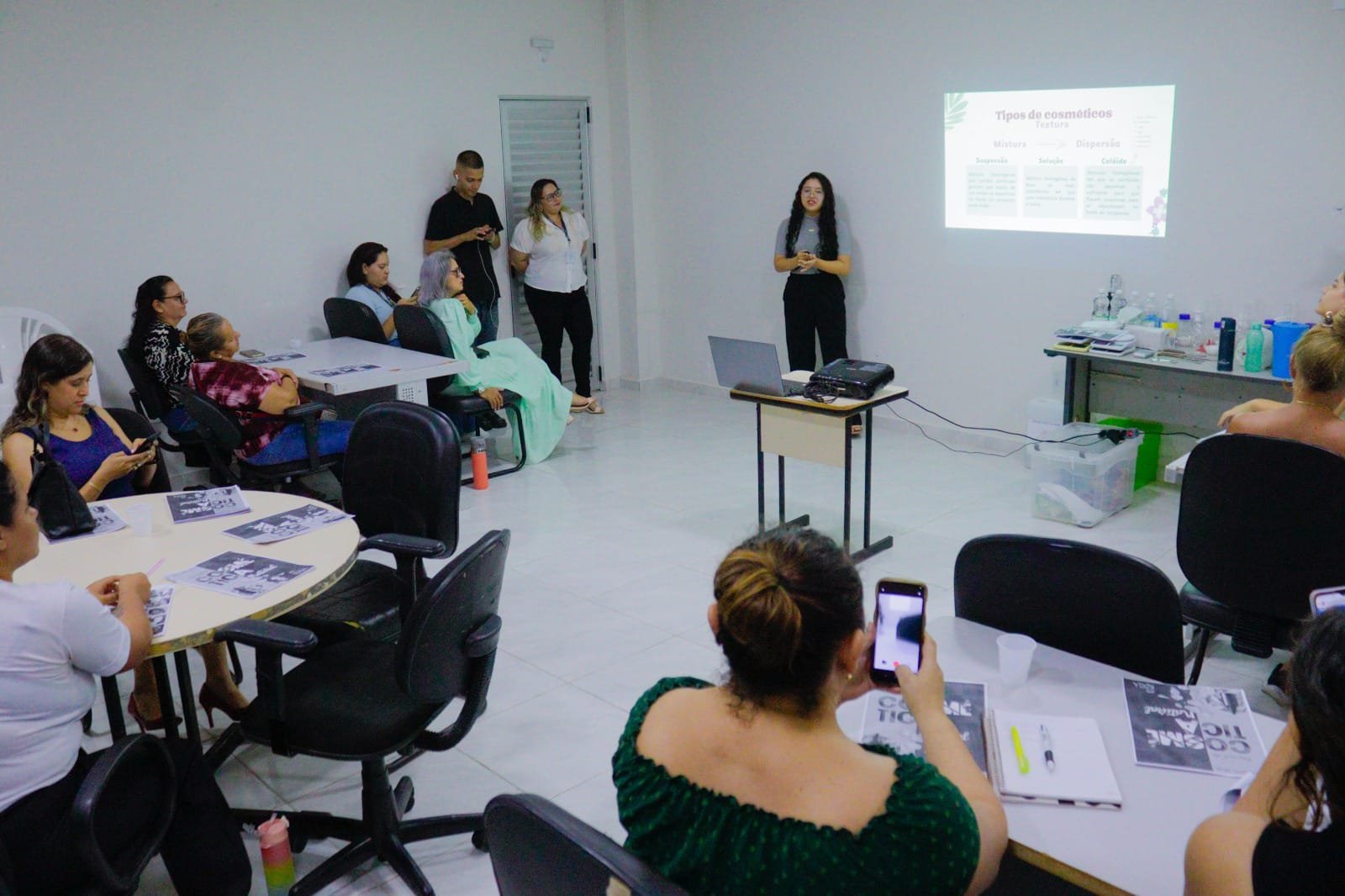 Na primeira aula do curso, todas tiveram uma introdução sobre os cosméticos, aprendendo sobre a diferença entre produtos naturais, orgânicos e veganos; composição; tipos; vantagens; sustentabilidade e a certificação e normas que devem ser seguidas na fabricação.