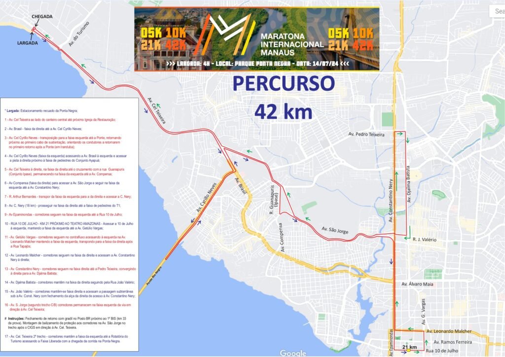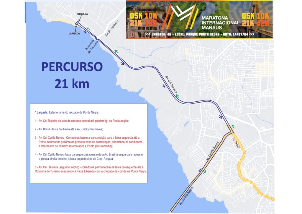 Na avenida Coronel Teixeira, os corredores permanecerão ao lado do canteiro central, até a faixa de pedestres próximo à igreja da Restauração. Na avenida Brasil, os corredores irão pela faixa da direita até a avenida Coronel Cyrillo Neves e transposição para a faixa esquerda até a ponte, retornando próximo ao primeiro cabo de sustentação. Os agentes estarão orientando os condutores a retornarem no primeiro retorno após a ponte (em Iranduba). No retorno à avenida Coronel Cyrillo Neves (faixa da esquerda), os corredores acessam a avenida Brasil à esquerda e a pista à direita, próximo à faixa de pedestres do conjunto Ayapuá.