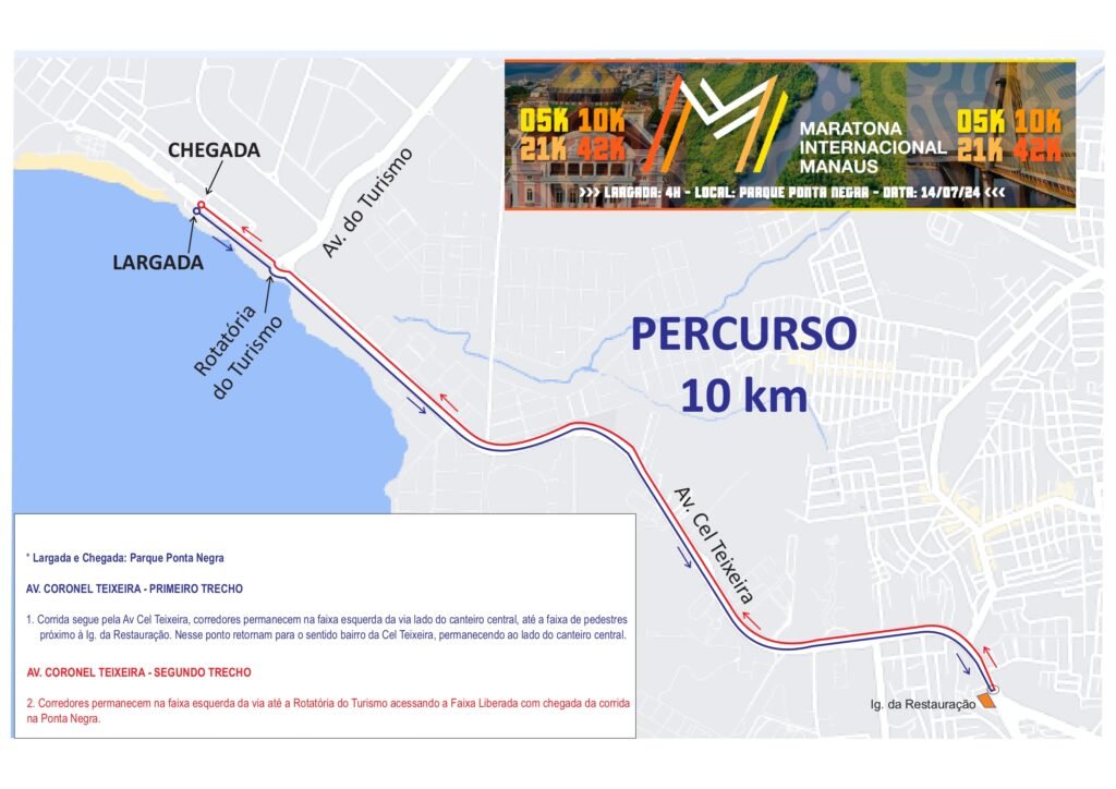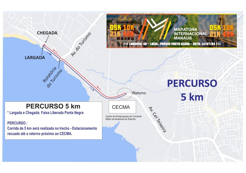 A maratona acontece na Ponta Negra, neste domingo, com largada prevista para as 4h. No percurso de cinco quilômetros, os corredores utilizarão a faixa esquerda da via ao lado do canteiro central até a proximidade do Centro de Embarcações do Comando Militar da Amazônia (Cecma). Nesse ponto, devem retornar para o sentido bairro da avenida Coronel Teixeira, permanecendo ao lado do canteiro central.