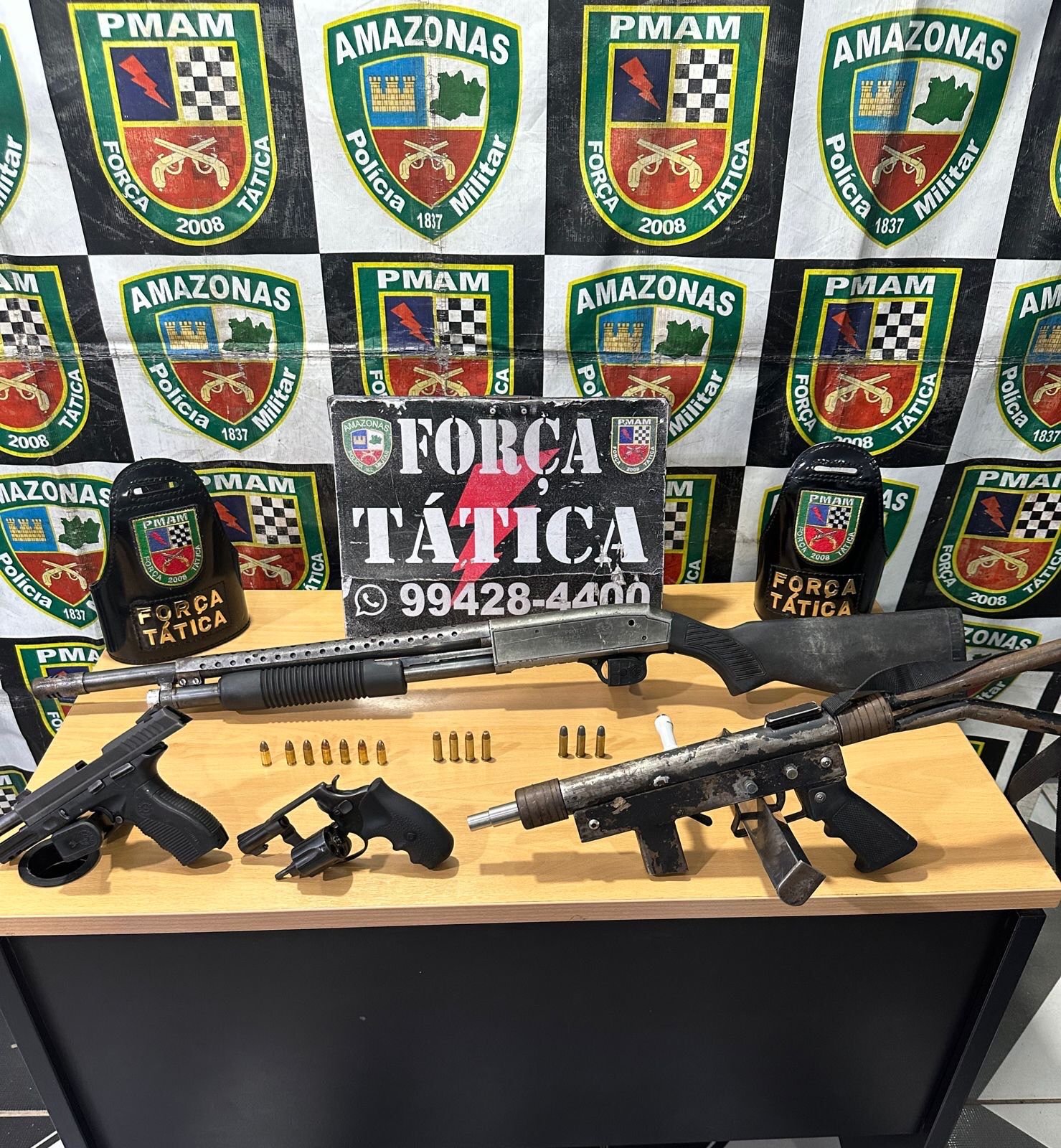 Somente nessa ocorrência, foram apreendidos uma pistola 840 com uma munição; uma espingarda calibre 12; uma submetralhadora 9 milímetros com sete munições; e um revólver calibre 38 também com sete munições.