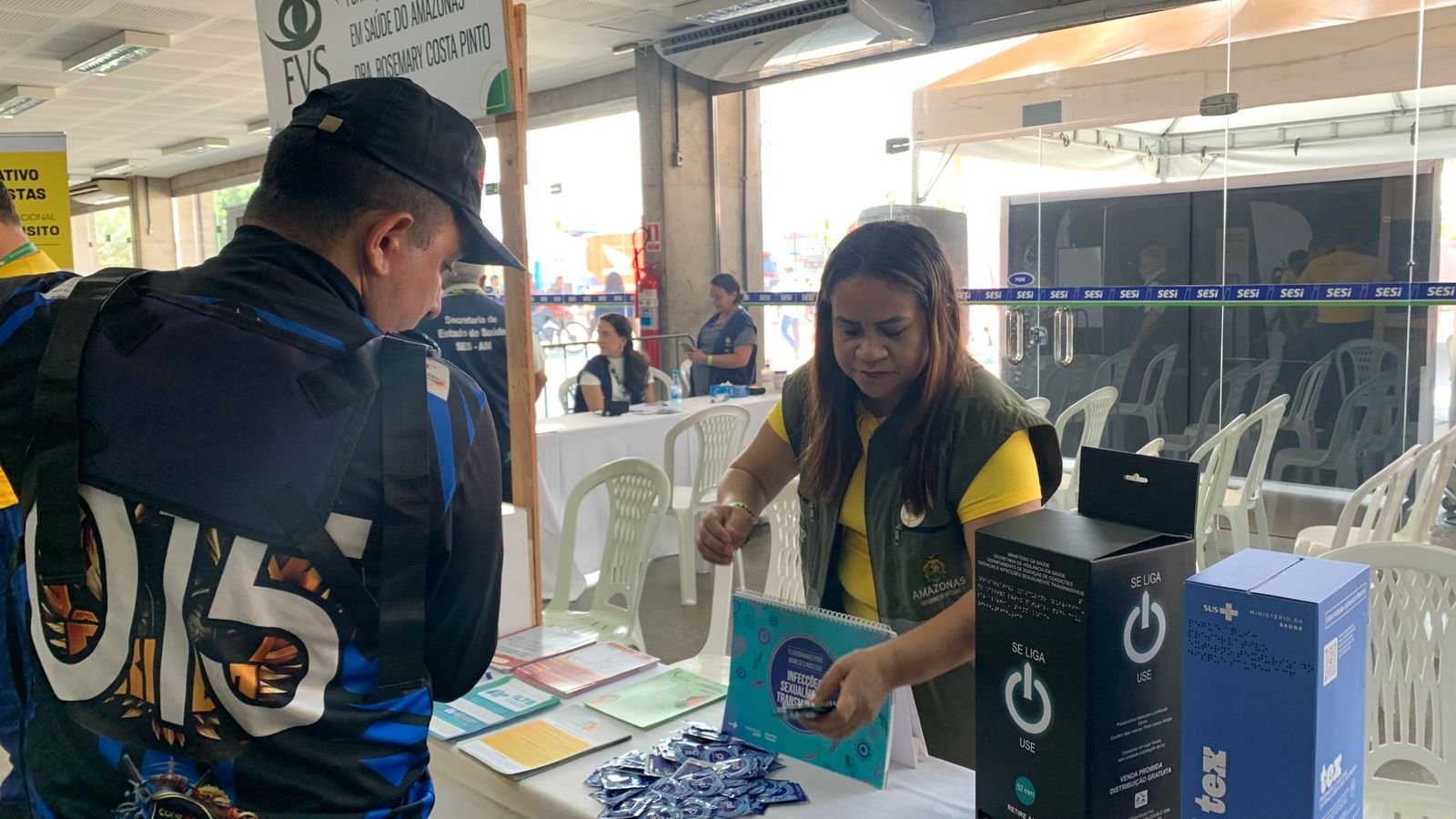 No estande da FVS-RCP, técnicos orientam a população sobre prevenção de acidentes de trânsito e infecções sexualmente transmissíveis (ISTs), além de distribuir materiais informativos, preservativos internos e externos, gel lubrificante e o novo preservativo texturizado.