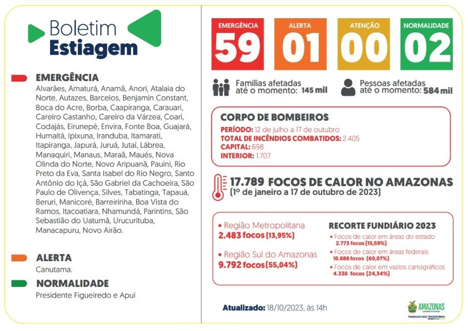 O Governo do Amazonas, por meio do Comitê de Intersetorial de Enfrentamento à Situação de Emergência Ambiental, divulga o boletim com informações atualizadas sobre a estiagem no estado, nesta quarta-feira (18/10).