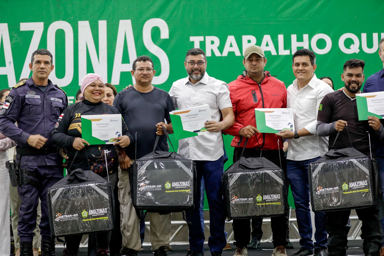 Além da entrega de 250 kits, que contam com colete de identificação, capacete de segurança, bag térmica, joelheiras, cotoveleiras e antena corta-pipa, o governador Wilson Lima também lançou oficialmente a plataforma dos cursos ofertados Eptran, em formato de Educação a Distância (EaD).