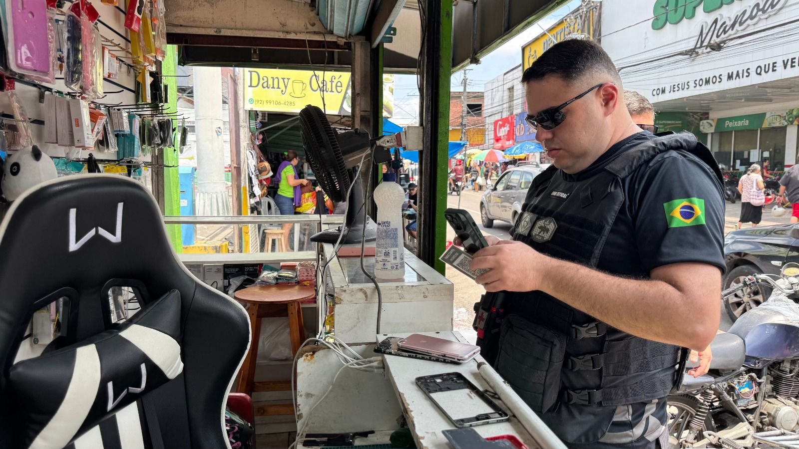 A Polícia Civil do Amazonas (PC-AM), por meio do Núcleo de Investigação e Recuperação de Celulares (Nirc) realizou, nesta sexta-feira (07/11) uma nova fase da operação RecuperaFone, no bairro Manoa, zona norte de Manaus. Na ação, nove lojas foram fiscalizadas, cinco aparelhos com restrição de roubo ou furto e uma motocicleta sem chassi foram apreendidas e duas pessoas encaminhadas para a delegacia.