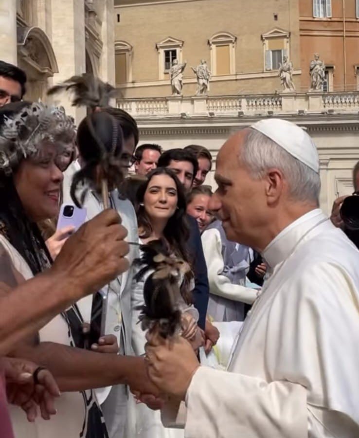 O Papa Leão XIV recebeu em audiência pública, na manhã desta quarta-feira, 1/10, a estilista e gestora do coletivo MI Moda Indígena, Rebeca Ferreira Munduruku, e tocou maracá com de artistas indígenas que estavam em grupo na praça São Pedro.