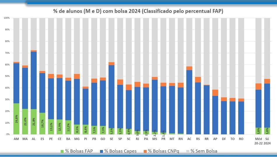 Os dados que baseiam o estudo levam em consideração as bolsas concedidas pelas FAPs, Conselho de Aperfeiçoamento de Pessoal em Nível Superior (Capes) e Conselho Nacional de Desenvolvimento Científico e Tecnológico (CNPq). O Amazonas aparece com o maior percentual, oriundo do investimento do Governo do Amazonas, via Fapeam, por meio do Programa de Apoio à Pós-Graduação Stricto Sensu (Posgrad), principalmente.