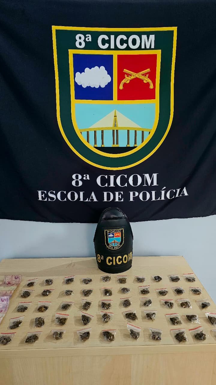 A dupla, ao perceber a aproximação da viatura policial, fugiu, mas foi alcançada e apreendida. Com eles foram encontradas 50 porções de maconha e R$10 reais em espécie.