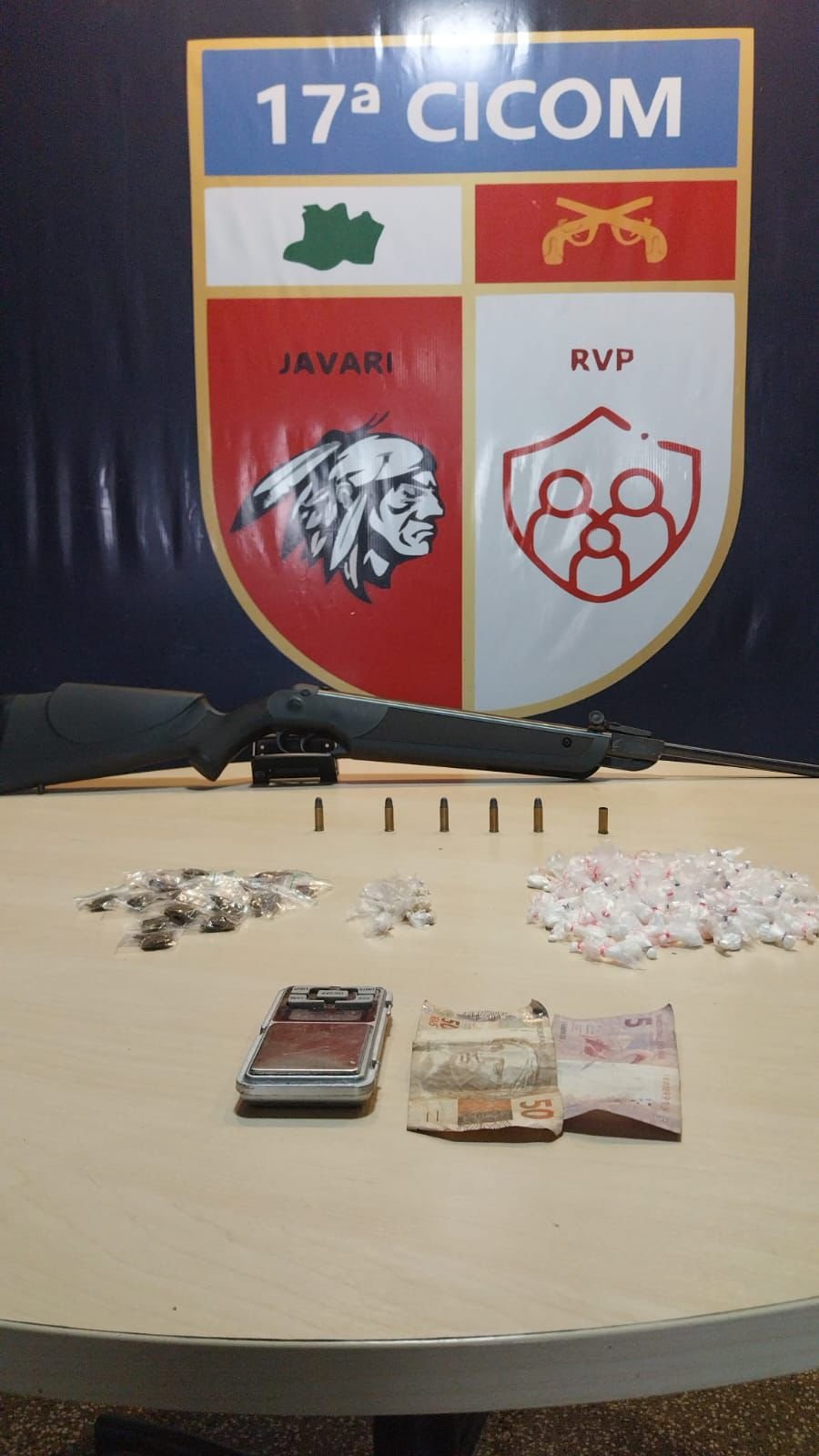 Durante a averiguação, os policiais militares localizaram uma espingarda calibre 32, municiada com cinco cartuchos, além de 13 envelopes plásticos de maconha, dez trouxinhas de oxi e 110 trouxinhas de cocaína, totalizando 133 trouxinhas de entorpecentes, uma balança de precisão e R$ 55 em espécie.