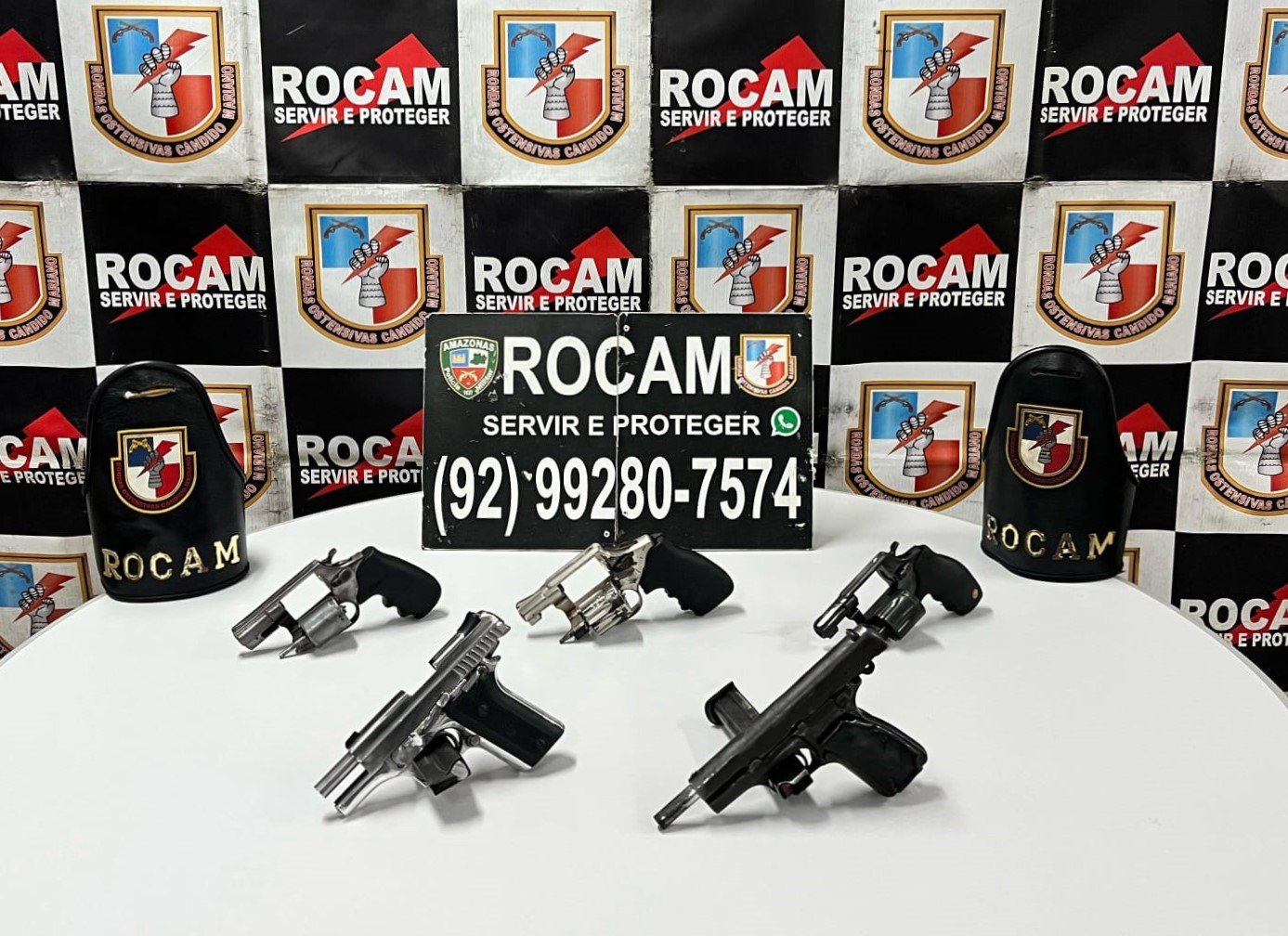 Ao realizarem buscas pela área, um dos homens foi encontrado, e ao realizarem a revista pessoal, foram apreendidos uma bolsa com três revólveres calibre 38 e duas pistolas calibre 380 e 9mm.