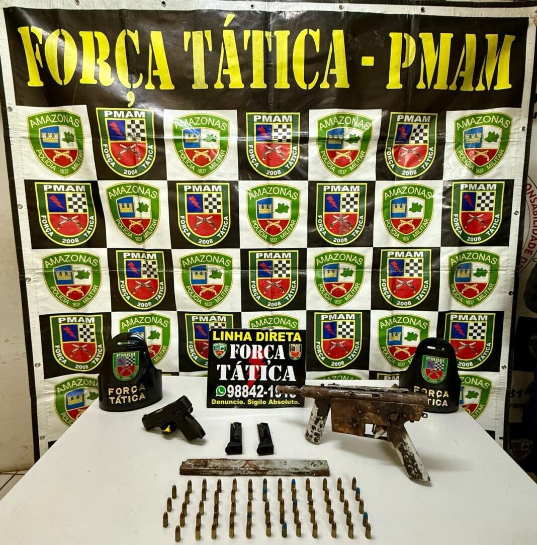 A Polícia Militar do Amazonas (PMAM), por meio da Força Tática, apreendeu, na noite desta quinta-feira (20/03), armas de fogo, entre elas uma submetralhadora de fabricação artesanal e munições, durante o cumprimento da operação Protetor das Fronteiras/Fronteira Mais Segura. A apreensão foi realizada em Iranduba (a 27 quilômetros de Manaus).