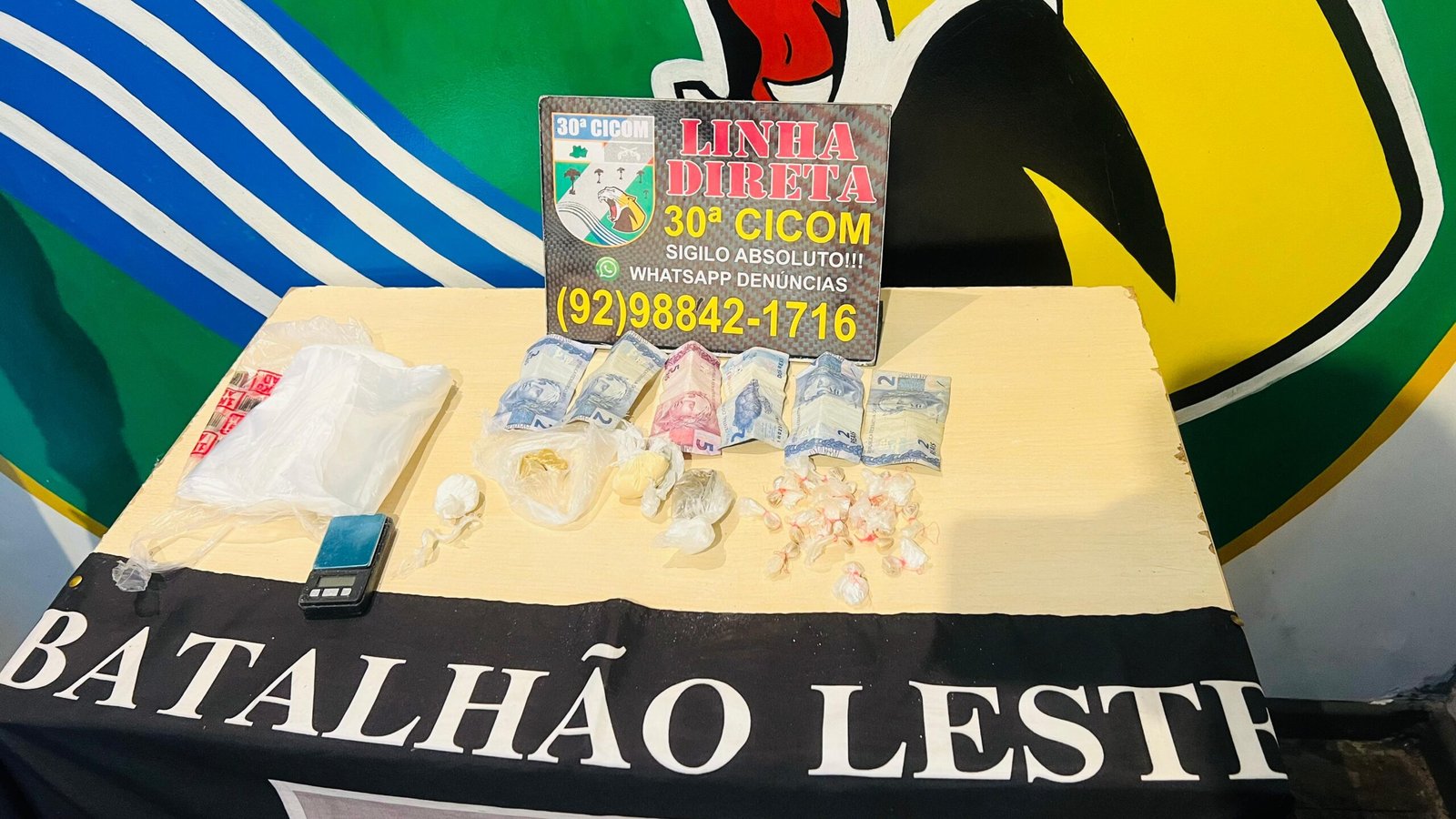 Com ele foram apreendidas quatro porções grandes de entorpecentes, sendo uma de pasta base de cocaína, uma de oxi, uma de maconha e uma de cocaína, além de 23 trouxinhas de oxi e uma balança de precisão. O homem, juntamente com os materiais apreendidos, foi conduzido ao 14º Distrito Integrado de Polícia (DIP).