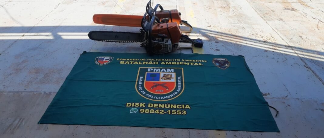 A equipe recebeu denúncia, via linha direta, sobre o desmatamento que acontecia próximo à Praia da Lua. Com o apoio da Companhia de Operações Fluviais, os militares se deslocaram até o Igarapé do Comprido, e no local identificaram os infratores com motosserra para a prática criminosa, sem a devida licença.