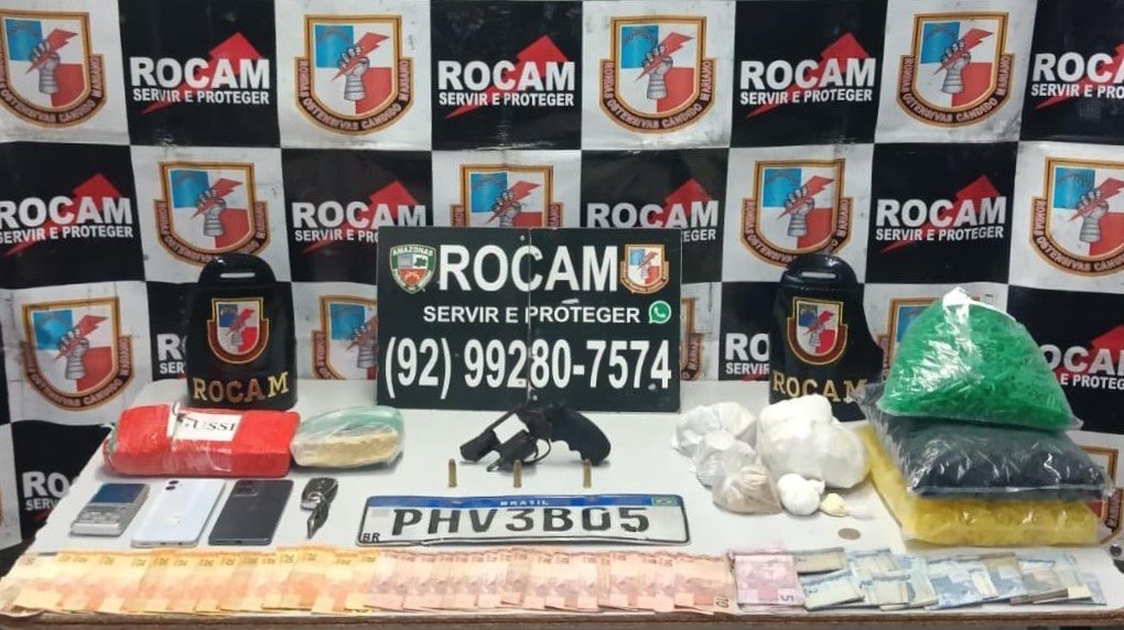 A equipe da PMAM iniciou as buscas e localizou o veículo com dois ocupantes. Após a abordagem, foi realizada revista no interior do automóvel, onde foram encontradas porções de oxi, uma arma de fogo calibre 38 e R$ 900 em espécie.