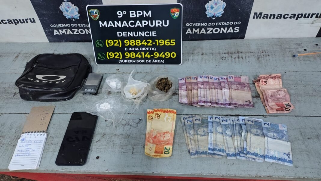 Em Manacapuru, PMs do 9º Batalhão de Polícia Militar (BPM) receberam denúncia de que um homem estava comercializando entorpecentes no bairro Duque de Ouro. Durante as diligências no local, os PMs encontraram, perto do suspeito, o material ilícito escondido sob uma tábua, dentro de uma bolsa.