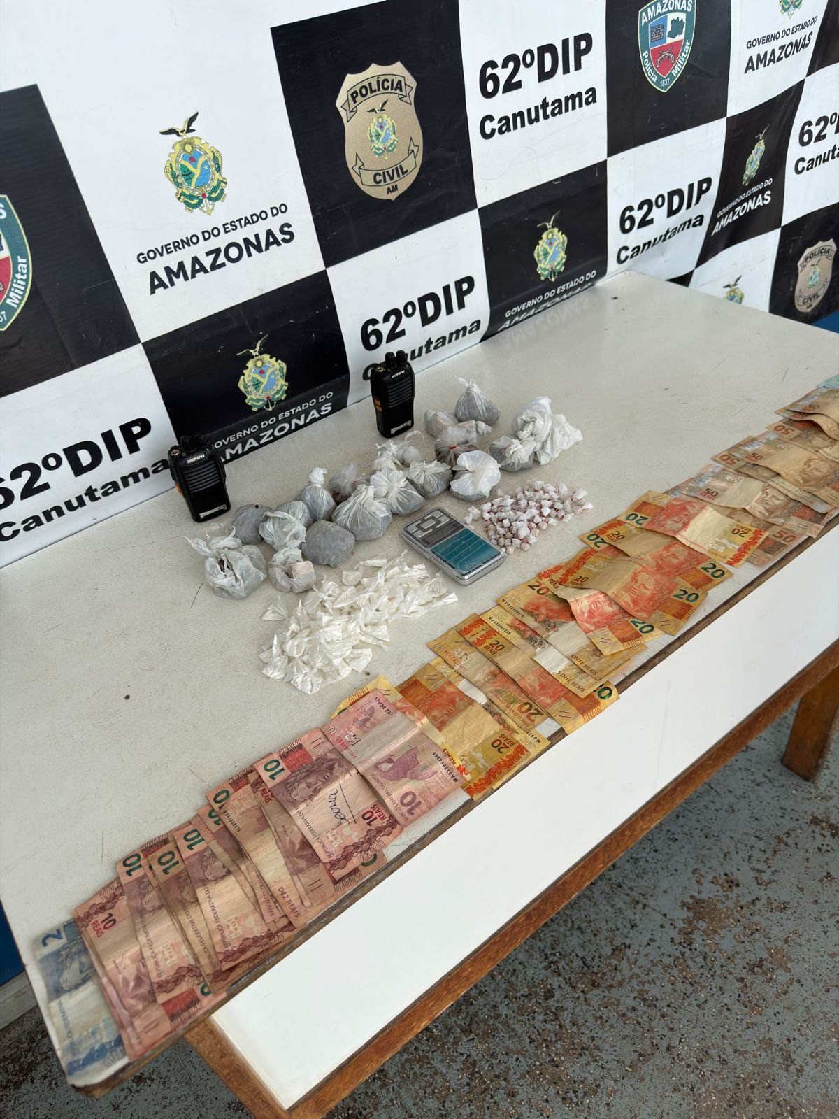Com os suspeito foram apreendidos dinheiro e balança de precisão