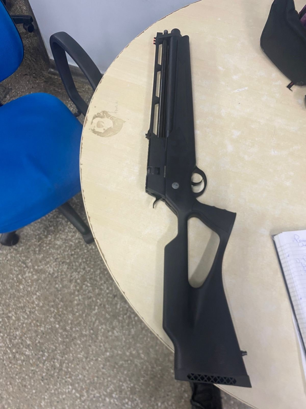 Diante da gravidade da situação, a equipe da 29ª Cicom realizou a abordagem do veículo, um Renault Sandero cinza, de placas OAB-8696. Durante a revista, os policiais militares encontraram com o suspeito uma carabina Rossi preta, calibre 5,5 mm, com capacidade para oito disparos e carregada com seis munições. As vítimas foram retiradas em segurança do veículo.