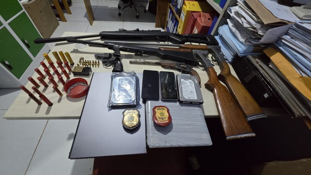 No cumprimento do mandado, foram encontradas seis armas de fogo e diversos dispositivos eletrônicos, que passaram por análise preliminar. As autoridades constataram a existência de conteúdo pornográfico envolvendo crianças e adolescentes, além de indícios de favorecimento à exploração sexual de menores, com suspeitas de participação de terceiros no aliciamento das vítimas.