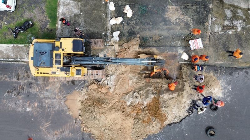Após atingir a cota de escavação de três metros de profundidade, as equipes estão dando continuidade aos serviços de forma manual devido à presença de duas adutoras da Águas de Manaus, que causam interferências e tornam o trabalho mais delicado e cuidadoso.