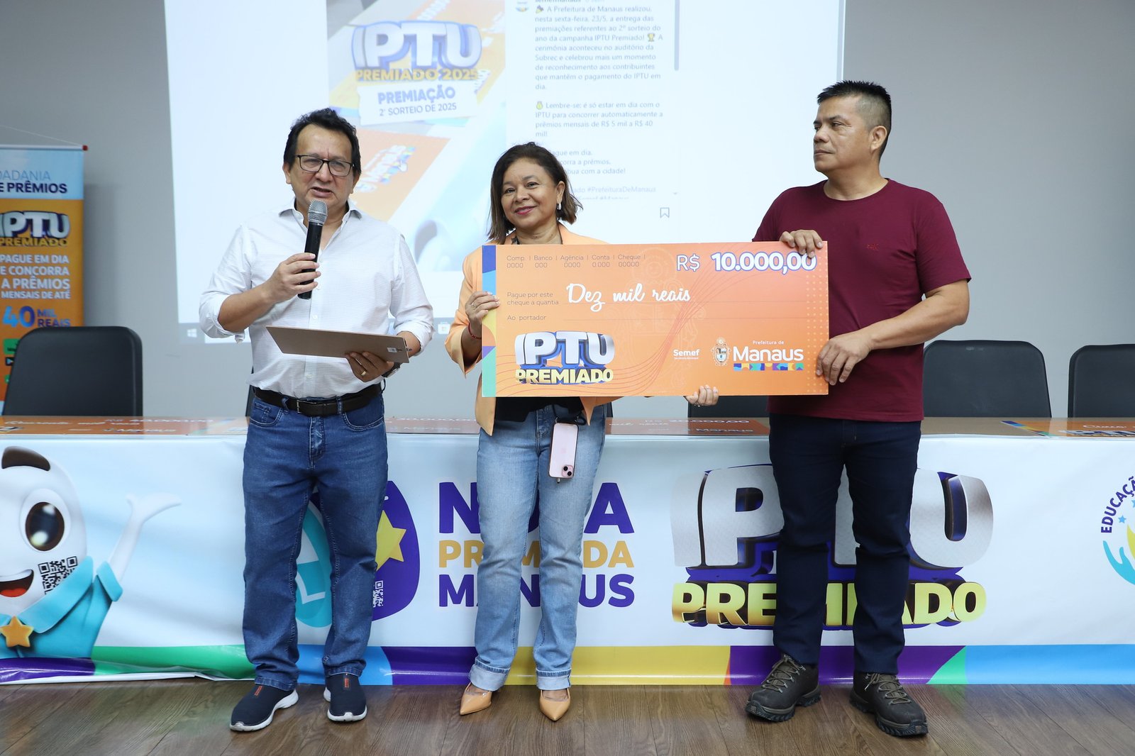 A Prefeitura de Manaus realizou, nesta quinta-feira, 11/7, mais uma entrega oficial dos prêmios referentes ao quarto sorteio do ano da campanha “IPTU Premiado” 2025, que tem como objetivo incentivar a adimplência dos contribuintes com o Imposto Predial e Territorial Urbano (IPTU). A cerimônia aconteceu no auditório da Subsecretaria da Receita da Secretaria Municipal de Finanças, Planejamento e Tecnologia da Informação (Semef), no anexo do Manaus Atende, localizado na avenida Japurá, bairro Centro, zona Sul da cidade.