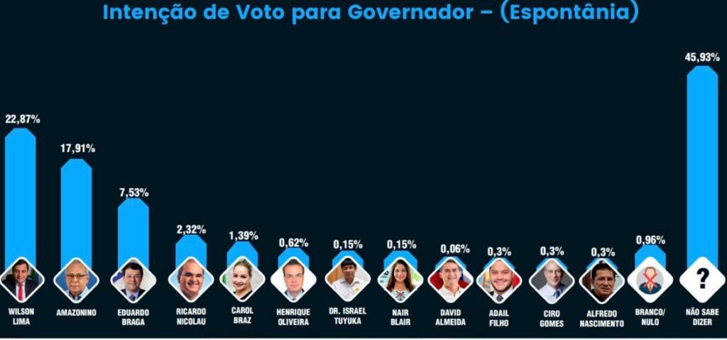 De acordo com o levantamento espontâneo, Wilson aparece com 22,87% das intenções votos, enquanto Amazonino Mendes (Cidadania) está com 17,91% e Eduardo Braga (MDB) amarga 7,53%.