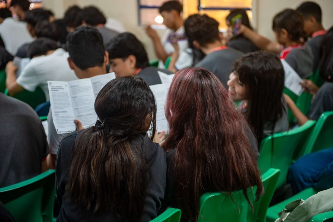 Com o objetivo de promover a conscientização entre estudantes da rede pública de ensino, a Secretaria de Estado de Justiça, Direitos Humanos e Cidadania (Sejusc), realizou, nesta segunda-feira (06/10), uma palestra de sensibilização sobre o tema violência contra as mulheres, para alunos com idades entre 15 anos e 17 anos da Escola Estadual Engenheiro Arthur Soares Amorim, localizada na zona norte da capital.