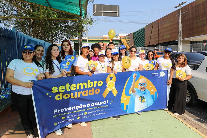 A Fundação Hospitalar de Hematologia e Hemoterapia do Amazonas (Hemoam) juntamente com o Grupo de Apoio à Criança com Câncer do Amazonas (GACC/AM) e o Grupo Raio de Sol realizaram nesta segunda-feira (09/09) uma blitz educativa para chamar atenção acerca do Setembro Dourado, mês de conscientização sobre o câncer infantojuvenil.