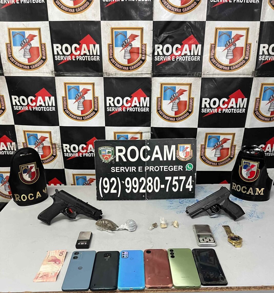 A Polícia Militar do Amazonas (PMAM), por meio das Rondas Ostensivas Cândido Mariano (Rocam), prendeu três homens, de idades entre 22 e 32 anos, suspeitos de envolvimento em ocorrências de roubo e tráfico de drogas, na noite de quarta-feira (13/08), no bairro Nossa Senhora de Fátima, zona norte de Manaus. Os homens possuem histórico criminal por pelo menos sete crimes.