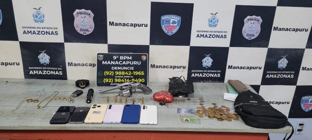 A Polícia Militar do Amazonas (PMAM), por meio do 9º Batalhão de Polícia Militar (9º BPM), prendeu três suspeitos de envolvimento em roubo, na noite de sexta-feira (14/11), em Manacapuru (a 68 quilômetros de Manaus). A ação resultou na recuperação de aparelhos celulares roubados, arma de fogo e veículo.